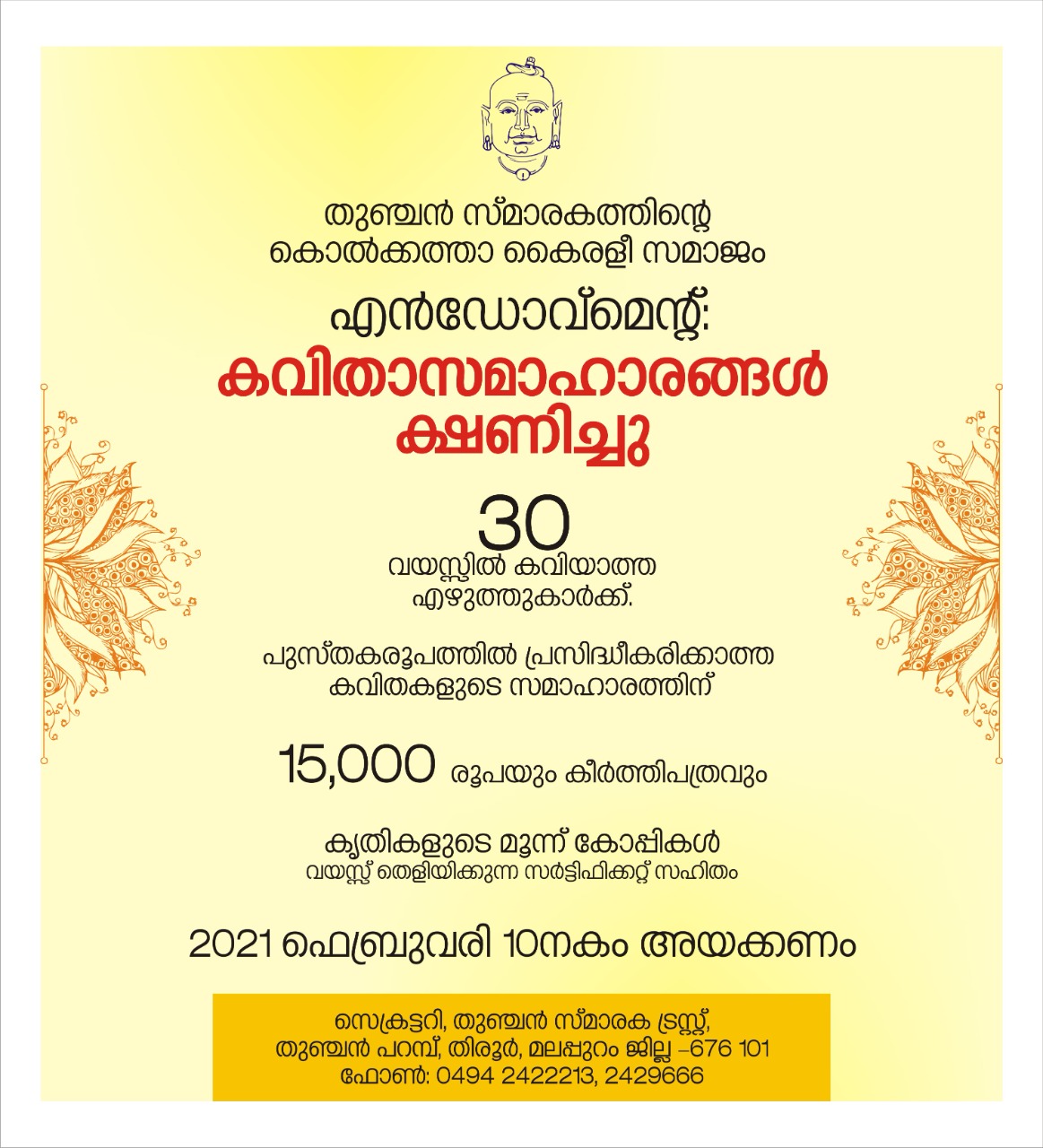 എൻഡോവ്മെന്റ് February 10,2021 - February 10,2021 Thunchan Memorial Trust & Research Centre എൻഡോവ്മെന്റ് Download Brochure